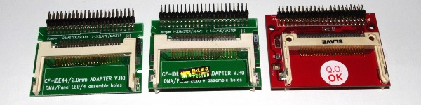 A word on SATA: I am fully aware of SATA being state of the art today. Unfortunately SATA is not even similar to IDE and broke compatibility with CF. It was a good decision to eliminate all the cruft coming from the 1980s: SATA doesn't know master/slave stories, jumper settings, single devices occupying the bus etc. Thus you need an intelligent™ adapter—more technically an electronic device—shoveling data from SATA link to the CF and vice-versa. I didn't test this but I read that you can have problems connecting more than one CF to these ports.