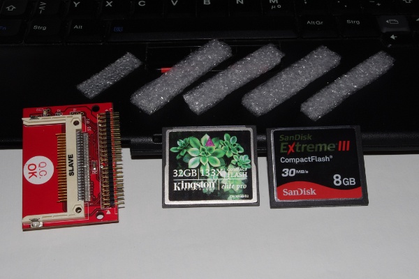 Propably the worst drawback at the time of writing is the high price of good SSDs. Additionally it is difficult to find one for the old IDE port. But to my surprise I found a cheap alternative to get the main advantages of SSDs another way: using Compact Flash drives.